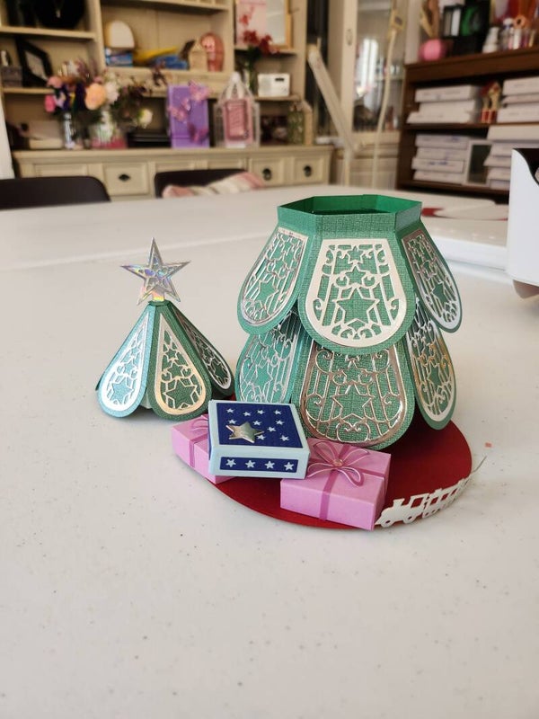 This Christmas tree box is hand crafted by a professional crafter. It comes on its own base plate with small imitation gift boxes.